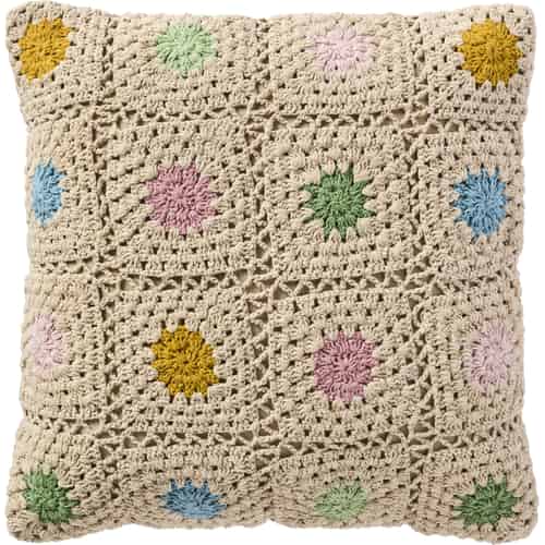 Ib Laursen Cushion Cover - Crocheted - Natural - Multicoloured Flowers, Backside Natural Coloured Canvas 50 x 50 cm