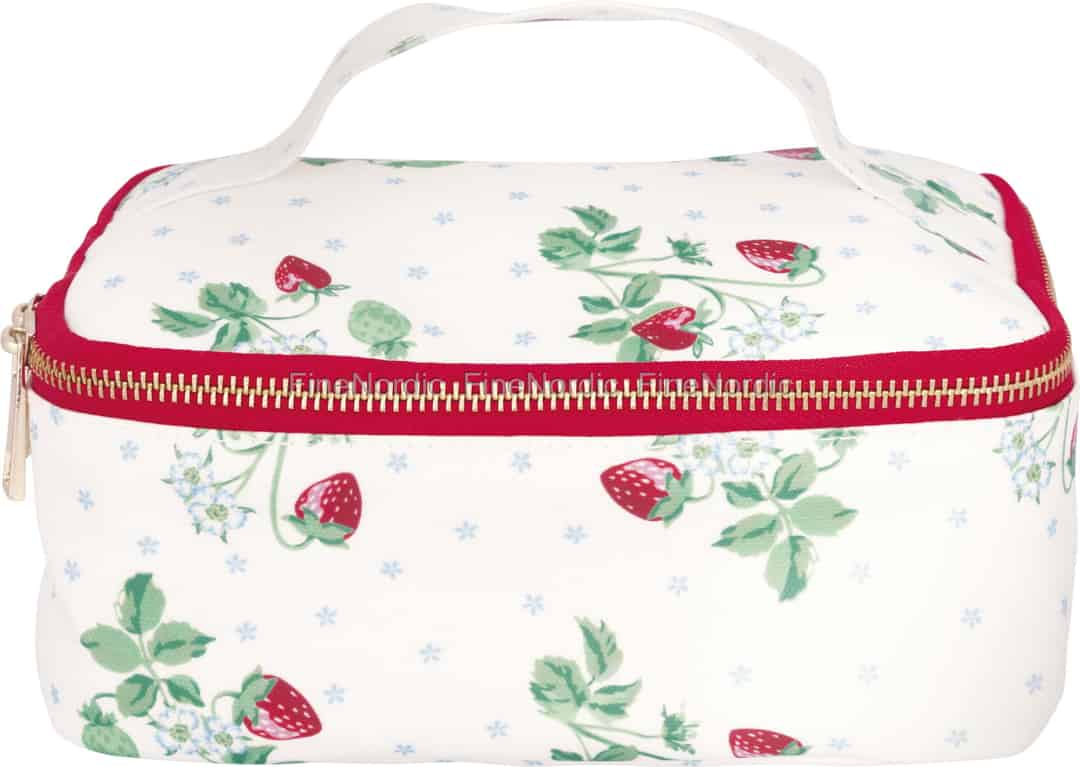 GreenGate’s "Berry White" collection captures the essence of a perfect summer’s day, and this charming cooler bag is no exception. The delightful pattern of ripe strawberries, delicate blossoms, and fresh green leaves is scattered across a creamy white oilcloth canvas, evoking the simple pleasure of wandering through a sun-drenched garden. It’s a design that feels both nostalgic and wonderfully fresh, turning a simple lunch carrier into a beautiful accessory you’ll love to use. The bold red zip with its golden brass teeth adds a final touch of cheerful contrast, promising that something lovely is kept inside.