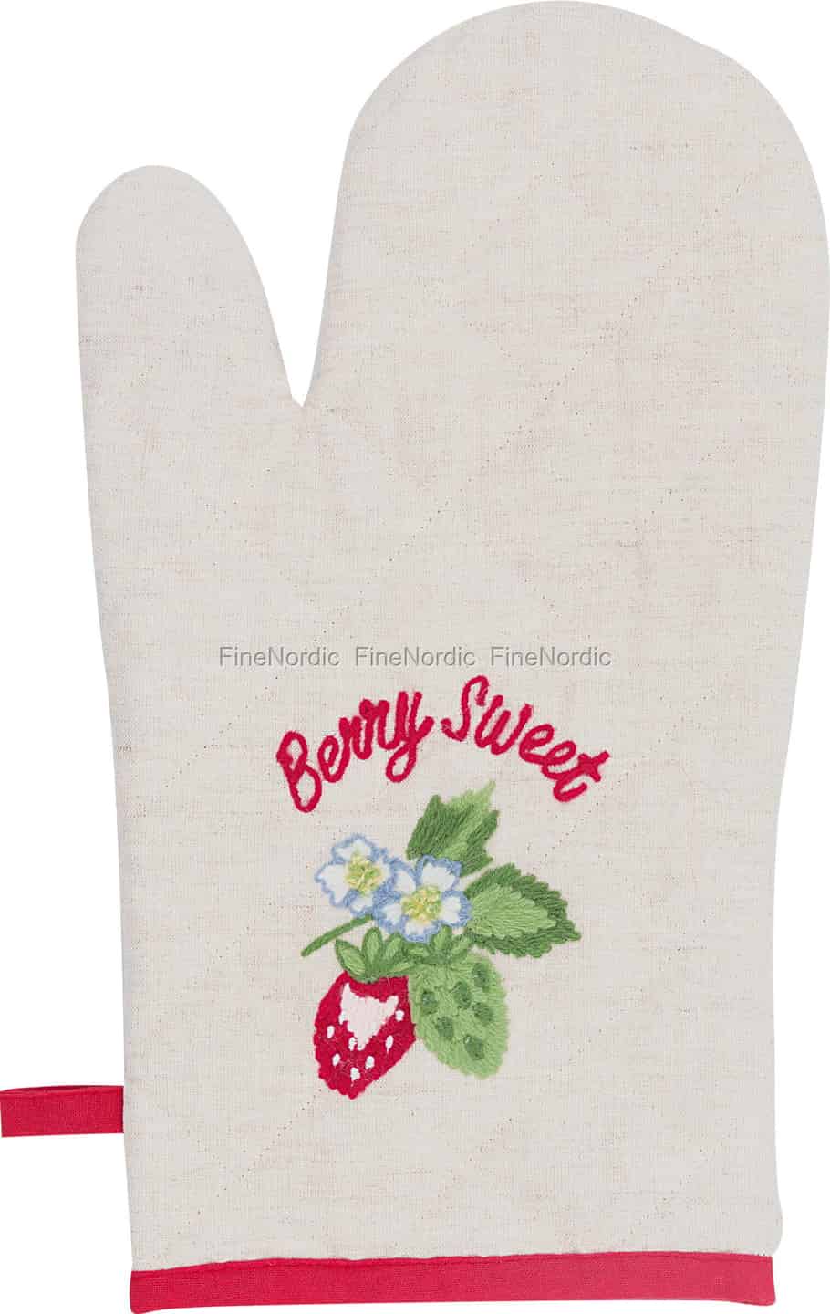GreenGate captures the essence of idyllic summer days with the Berry Sand collection. This beautiful grill glove is a testament to their love for nostalgic charm, featuring intricate embroidery on a backdrop of natural, sand-coloured cotton. The quilted texture feels reassuringly thick, while the playful 'Berry Sweet' message and strawberry motif will bring a smile to your face as you retrieve golden-brown scones or a bubbling casserole from the heat.