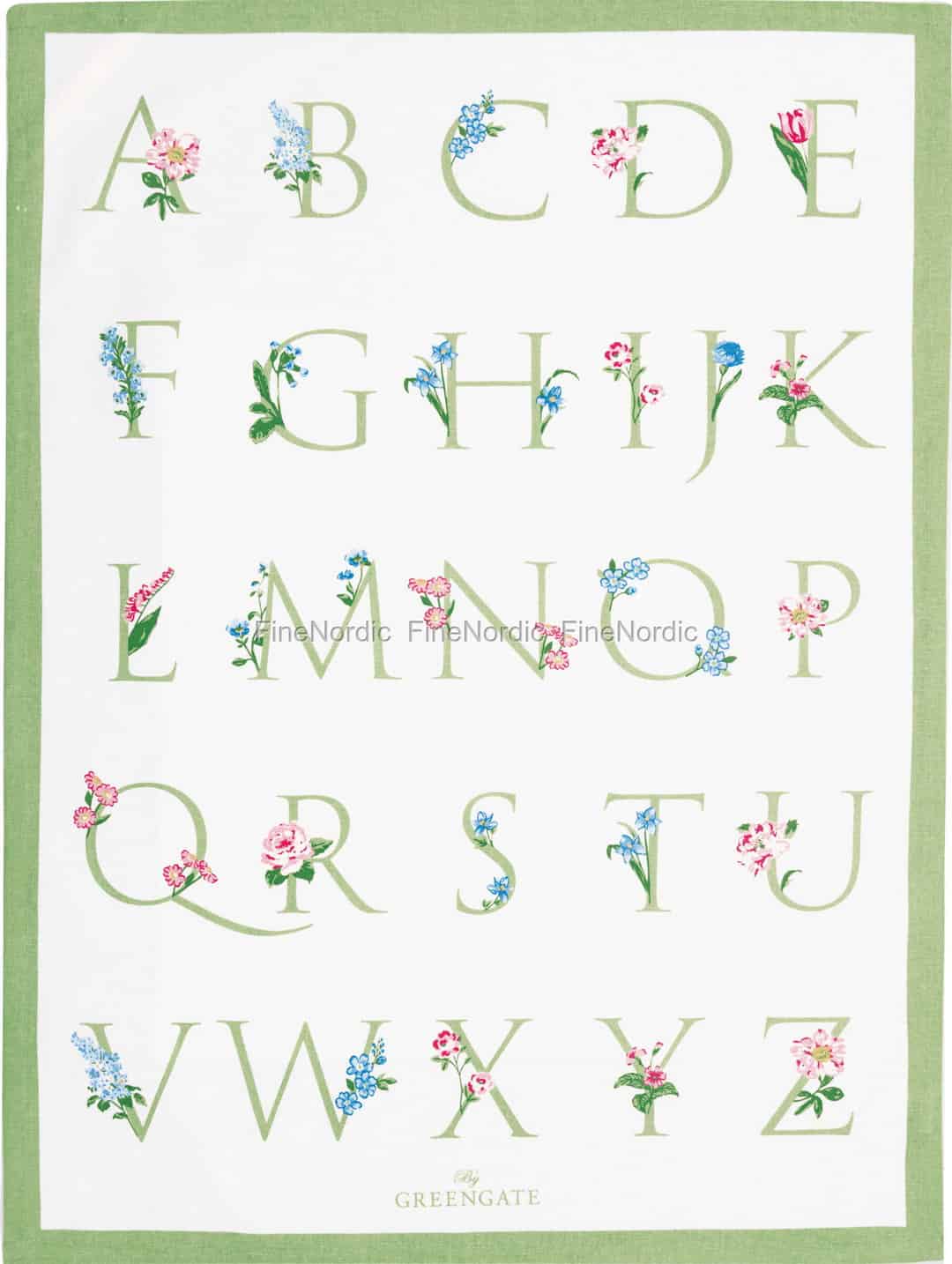Introduce a touch of whimsical learning and botanical beauty to your kitchen. This delightful cotton tea towel from GreenGate turns a simple household essential into a piece of art, blending classic typography with the delicate charm of a summer garden.