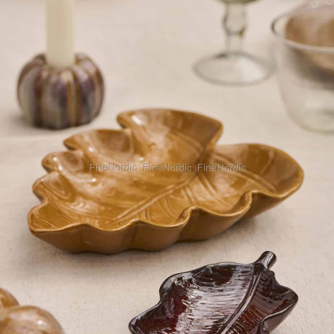 Crafted by Ib Laursen, this beautiful ceramic bowl is a quiet celebration of nature's simple forms. Its generous leaf shape is finished in a warm, mustard-brown glaze that glows with an inviting sheen, reminiscent of golden hour light filtering through an autumn forest. The delicately embossed veins add a layer of texture, making it a piece that feels as lovely as it looks. It’s a wonderful way to bring a touch of the outdoors to your indoor sanctuary, creating a sense of calm and connection.