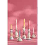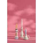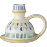 Let the gentle charm of this Ib Laursen candle holder fill your space with light and personality. The off-white ceramic serves as the perfect canvas for a delightful scene: cheerful yellow lines frame bands of green and blue stripes, while a garland of blue wildflowers suggests a walk through a sun-dappled meadow. Its glossy finish catches the light, enhancing the colours and adding a subtle gleam to its surface. This isn't just a candle holder; it's a small piece of functional art that tells a story of simple, rustic beauty.