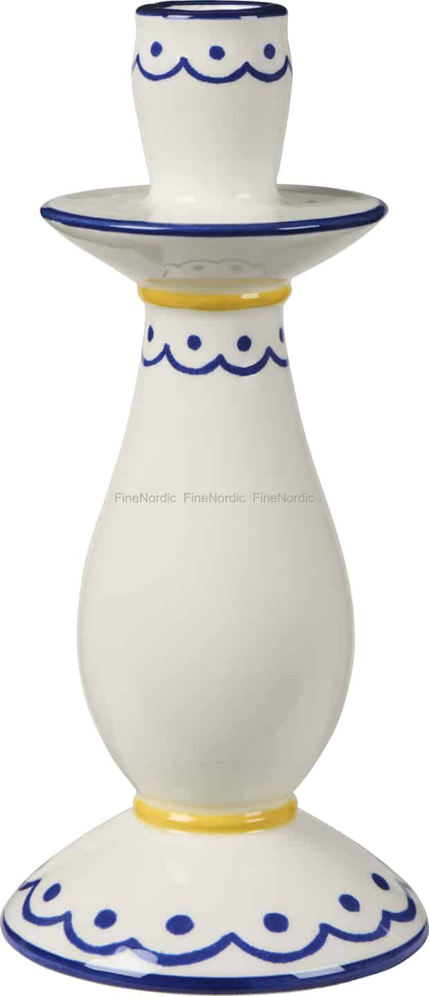 Inspired by the cheerful simplicity of a Danish summer cottage, this beautiful candle holder from Ib Laursen is a small celebration of colour and craft. The glossy, off-white ceramic provides the perfect canvas for the deep blue, hand-painted scalloped patterns that dance around its base and rim. Bright, sunny yellow bands add a joyful contrast, catching the light and evoking memories of long, sunlit afternoons. You can feel the care in its smooth, sturdy form, a testament to thoughtful design that is meant to be cherished.