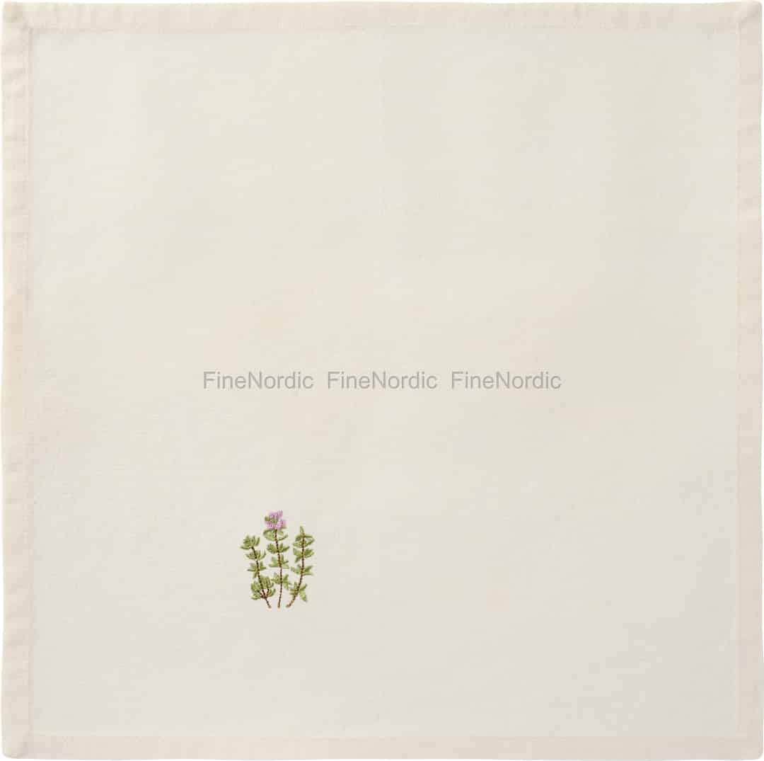Invite the gentle charm of a Scandinavian summer to your dining table. This beautifully simple butter-cream napkin from Ib Laursen is adorned with a single, delicate sprig of embroidered thyme, a subtle nod to nature's quiet beauty.