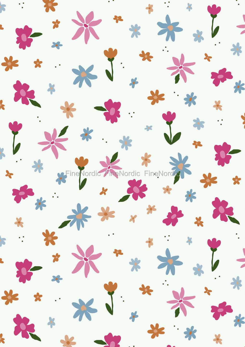 - A Cheerful, Whimsical Design: A delightful meadow of stylised flowers in magenta, blue, and ochre dances across an off-white background, bringing a touch of whimsical Scandinavian charm to any occasion.