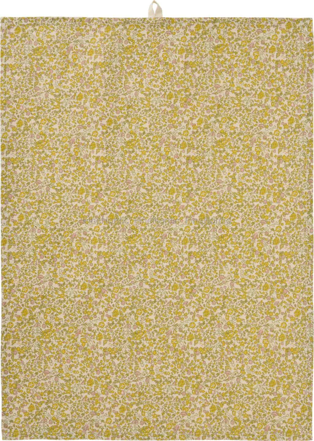 The Rita tea towel from Ib Laursen is like a little piece of a sunlit meadow, captured on soft, natural cotton. Its surface is scattered with a dense ditsy floral print, where cheerful yellow and soft pink blooms mingle with delicate green foliage. This charming design evokes the simple joy of gathering wildflowers on a summer's day, bringing an air of warmth and authentic country style to the heart of your home. It’s a design that tells a story of slow living and finding beauty in the everyday.