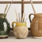 - Holding artist's brushes or pottery tools in a creative workspace.