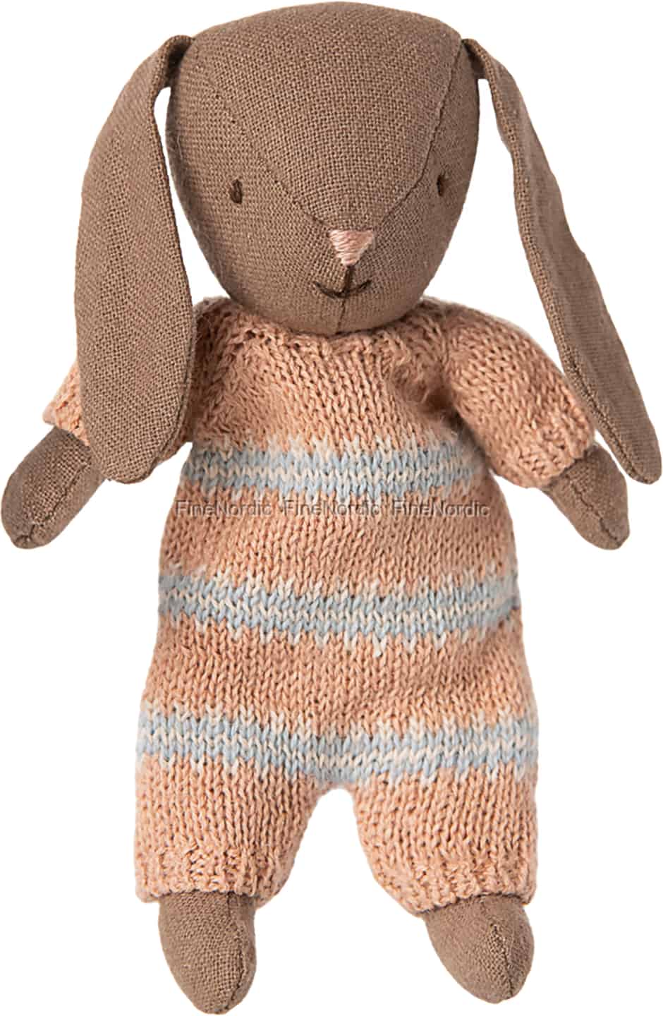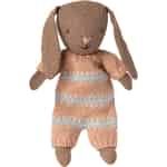 In the magical world of Maileg, even the smallest friends have the biggest hearts. This sweet brown bunny, dressed in a soft, striped suit of dusty rose and pale blue, is ready to become a cherished character in your child's imaginative tales. Its gentle expression and floppy ears invite quiet conversations and shared secrets, making it a wonderful first companion for little storytellers. From morning cuddles to afternoon adventures in the dollhouse, this bunny is a constant, comforting friend.