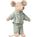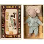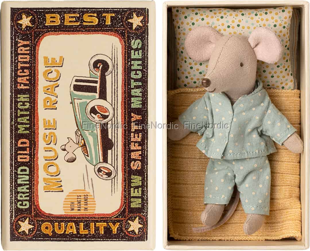 Discover the enchanting world of Maileg, where stories begin by sliding open a little matchbox. Inside, you'll find the Little Brother Mouse, a pocket-sized companion with a heart full of adventure. His vintage-inspired matchbox, adorned with a classic 'Mouse Race' illustration, hints at the day's daring escapades, while his soft, polka-dot pyjamas signal it's soon time to rest. He comes complete with his own snug bedding, ready to be tucked in after a long day of play.