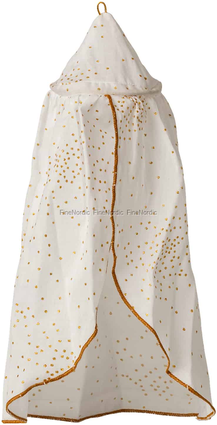 Every cherished Maileg friend deserves a special place to rest their head. This exquisite miniature canopy transforms a simple bed into a royal chamber or a magical glade. The soft, off-white textile drapes beautifully, dotted with shimmering gold speckles that catch the light like distant stars. A delicate braided gold cord trims the edges, adding a final touch of fairytale charm to this enchanting piece.