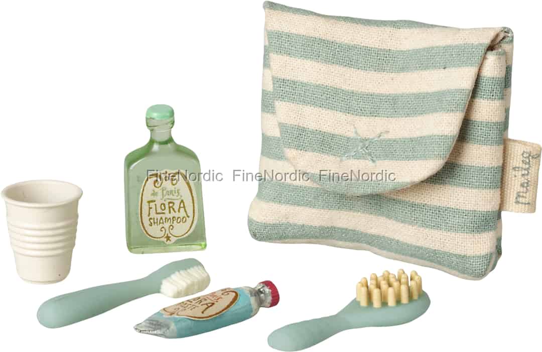 Imagine your little mouse friend waking with the sun, ready to start the day. They can brush their teeth with the tiny toothbrush, take a sip of water from the little cup, and pack their striped wash bag for a grand adventure. Every piece in this set is crafted with the love and attention to detail that makes Maileg so special, from the vintage-style labels to the soft texture of the fabric bag.