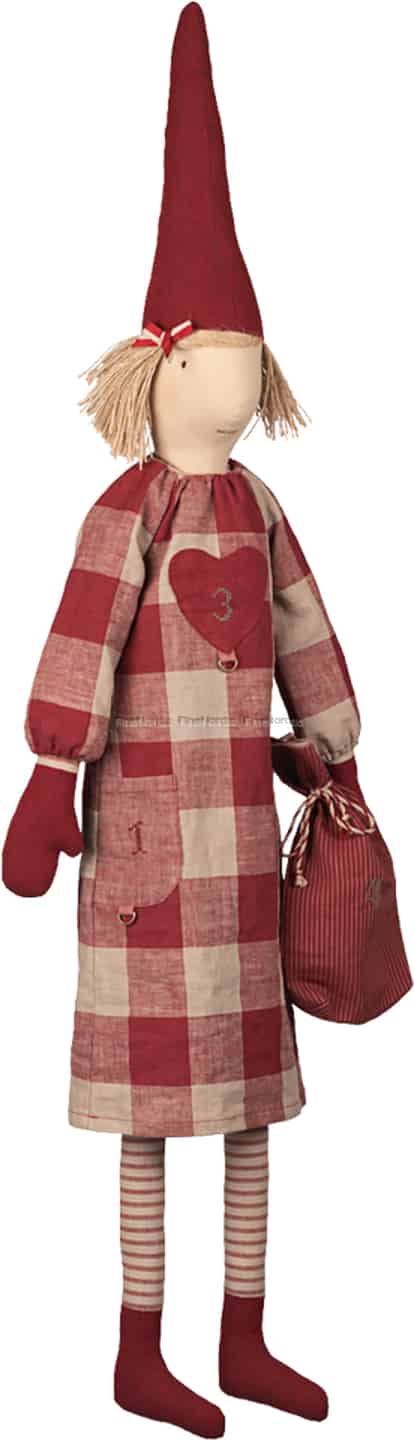 Imagine the delight as this gentle pixy friend finds her place in your home, perhaps sitting quietly in a favourite chair or hanging by the fireplace, her sweet, embroidered face watching over the festive preparations. Her beautifully crafted textile dress, with its soft, checked pattern and heart-shaped pockets, invites curious hands to discover the little treats you've hidden for each Sunday of Advent. She is more than a calendar; she is a keeper of secrets and a companion for the most wonderful time of the year.