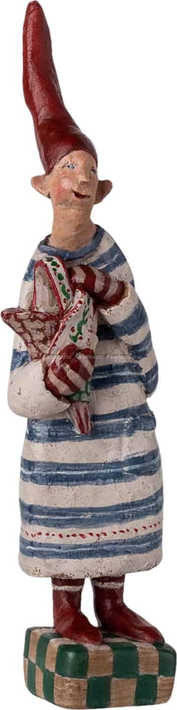 In the heart of a snow-dusted Danish village, the Noilly Noël pixies are known for their quiet mischief and festive spirit. This year's character, No. 36, is no exception. With rosy cheeks and a twinkle in his eye, he stands proudly on his checkered block, dressed in his favourite blue and white striped tunic. He clutches a little sack, a beautifully decorated stocking peeking out, hinting at the small joys and surprises he has gathered for the household. His tall red hat, a signature of his clan, bobs gently as he watches over the home, ensuring all is calm and bright.