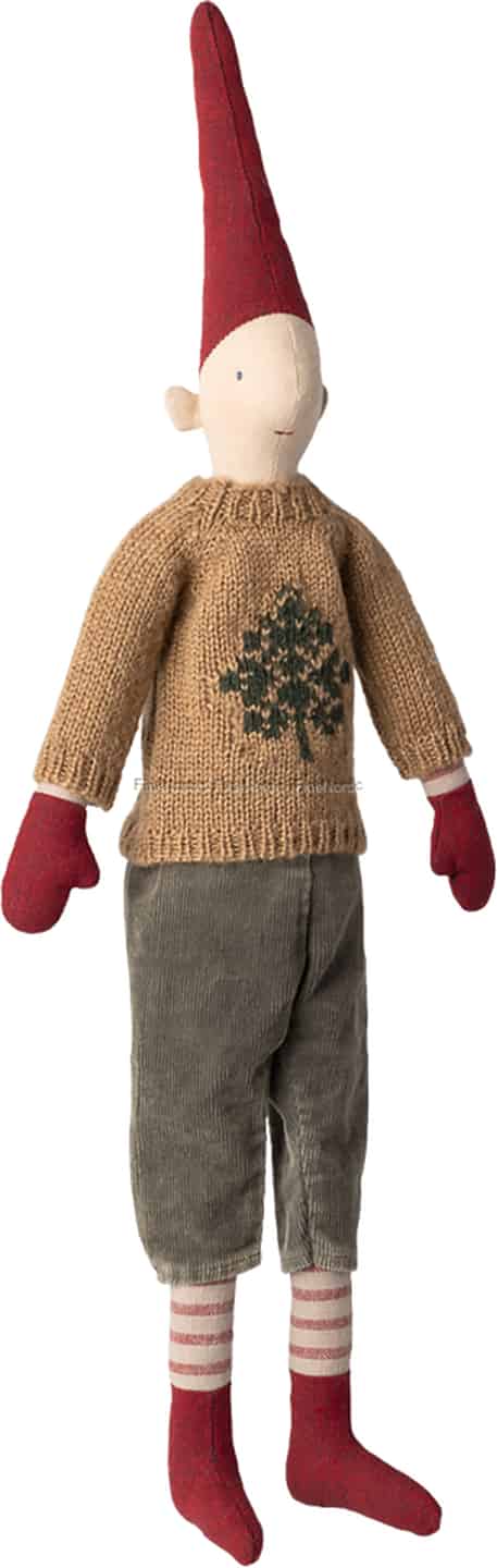 Meet your new festive guardian, a Maileg pixy whose character is stitched into every detail. From the top of his tall, ruby-red hat to the tips of his matching boots, he embodies the heart of a Nordic winter. His beautifully knitted sweater, adorned with a single evergreen tree, tells of forest walks on crisp mornings. His soft corduroy trousers and warm mittens suggest he's just stepped in from the cold, ready to find a cosy nook in your home.