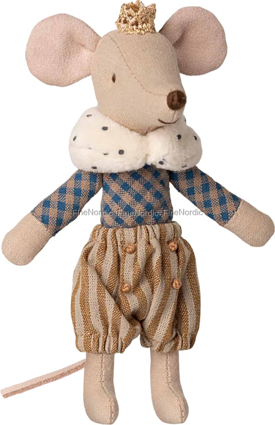Meet the Prince Big Brother mouse, a noble character from the enchanting world of Maileg. Every detail has been thoughtfully considered, from his glittering gold crown to the tiny buttons on his ocher-striped trousers. His soft, spotted ruff and kindly embroidered smile give him a gentle personality, ready to rule his miniature kingdom with wisdom and warmth. He is more than just a toy; he is a keeper of secrets and a companion for grand adventures.