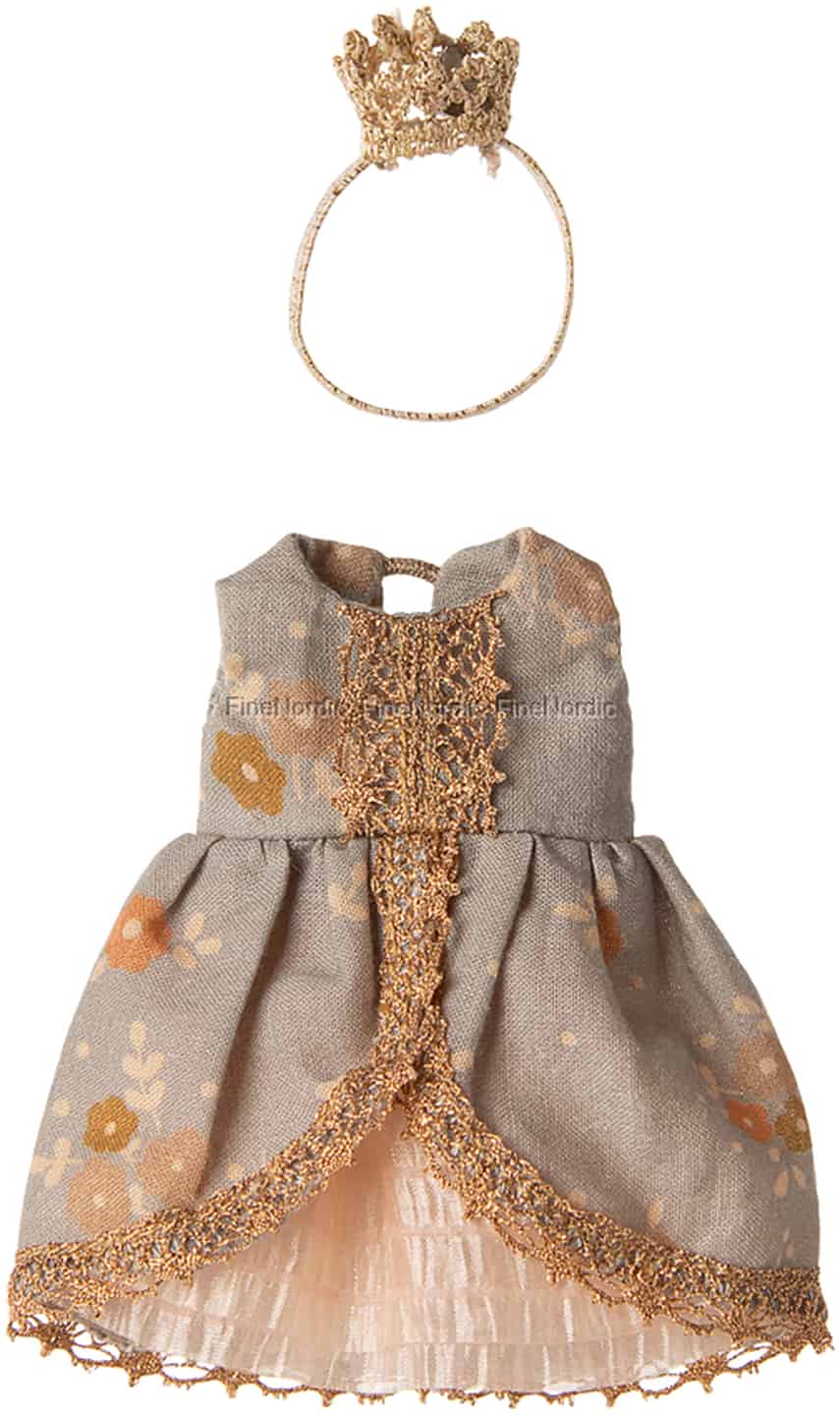 Let your Maileg stories blossom with this truly enchanting princess dress. The gown is fashioned from a beautiful textile in a muted, dusty grey-blue, scattered with a delicate floral pattern reminiscent of a palace garden. Running down the bodice and trimming the hem is a shimmering gold lace, intricately woven to catch the light and the eye of every little courtier. A fine, sheer underskirt adds a lovely touch of volume, making it perfect for twirling at the grand ball.