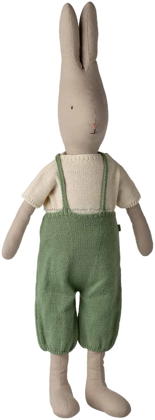 In the magical world of Maileg, toys are made to spark imagination and be passed down through generations. This classic Size 5 rabbit embodies that spirit completely. Its body, crafted from a wonderfully tactile textile, feels comforting and real in a child's arms. Dressed in a soft knitted shirt and charming green overalls, every detail is considered, from the gentle stitch of its nose to the tips of its long, listening ears. This isn't just a toy; it's a quiet confidant and a steadfast friend.