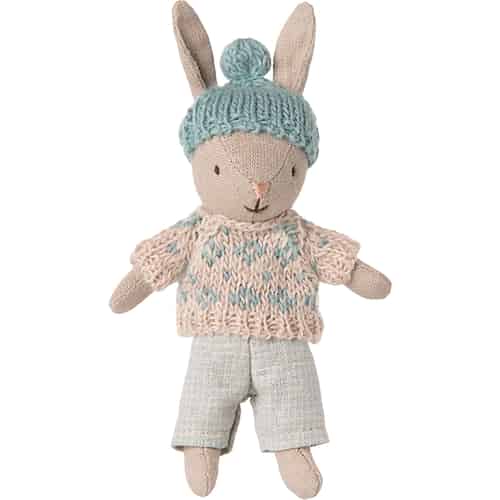 Discover Maileg’s wonderful and unique rabbit world! Rabbits to love and to inspire children’s imagination, Maileg bunnies to collect and Maileg bunnies to give as presents. Maileg’s rabbits are perfect friends for the entire childhood and due to Maileg’s excellent quality, they will last for many years to come. Here you can find bunnies in the sizes: My, Micro, Mini, Medium, Maxi, Mega and Mega Maxi. We also have wonderful Maileg furniture like beds, benches, highchairs and cribs, where the bunnies can sleep, sit, laugh and share long conversations with their little human friends. Thanks to the large selection of bunny clothing, your Maileg bunny can be dressed with the right wardrobe for every play adventure. Adorable outfits for each bunny size and all made with lots of love and attention to detail. Charming little shoes, little knitted sweaters, flower dresses, colorful pants, comfortable pyjamas, jeans and knitted hats and caps: Sweet and very fashionable play friends for your children!