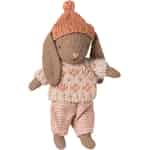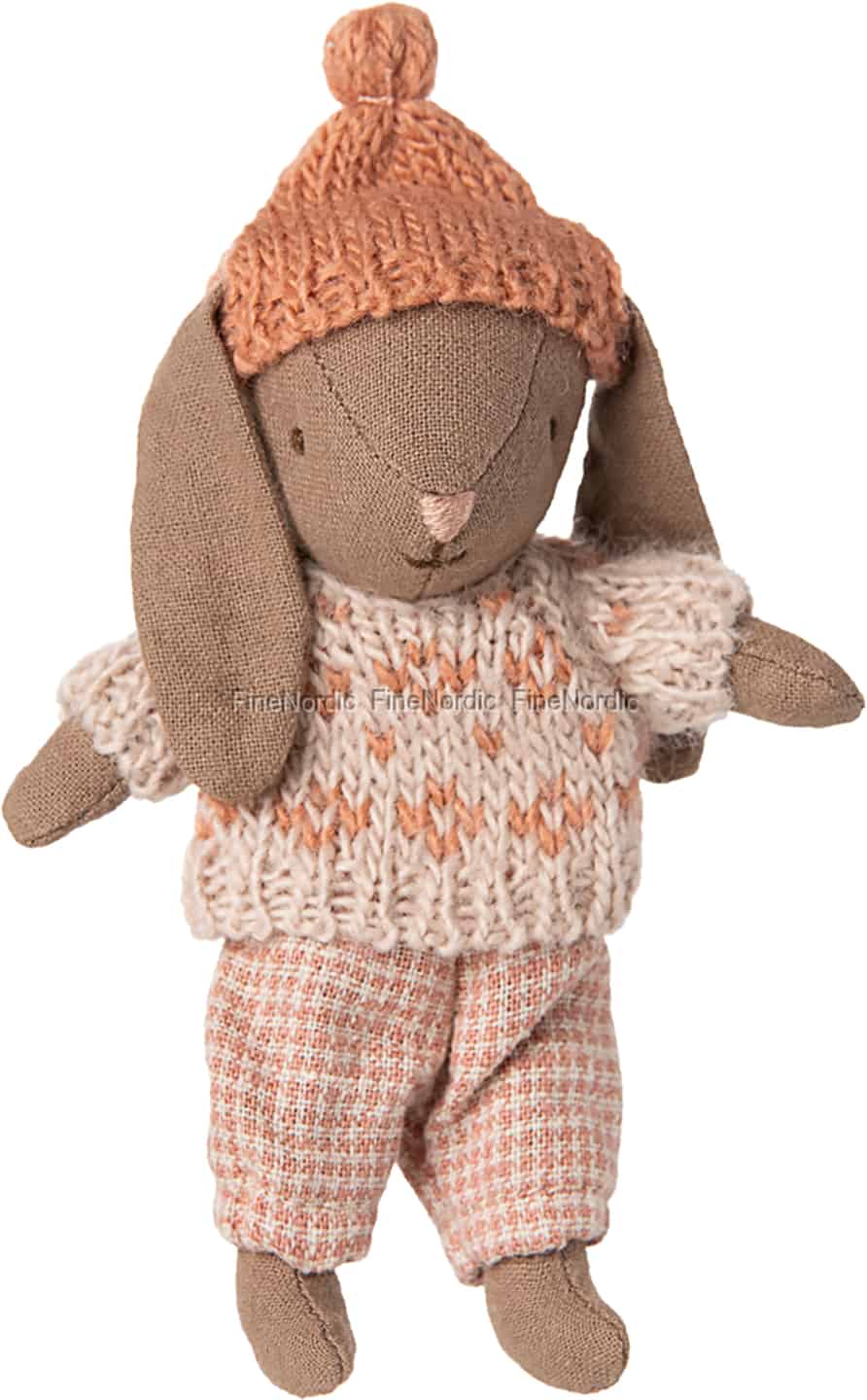 Imagine a crisp winter's day, where tiny footprints mark the snow. This sweet bunny, with its warm brown textile body, is all dressed for the occasion. Feel the softness of its chunky knit jumper, patterned with gentle rose chevrons, and admire the tiny pom-pom on its matching hat. Its little checked trousers are perfect for afternoons spent by a miniature fireplace, sharing secrets with other Maileg friends.