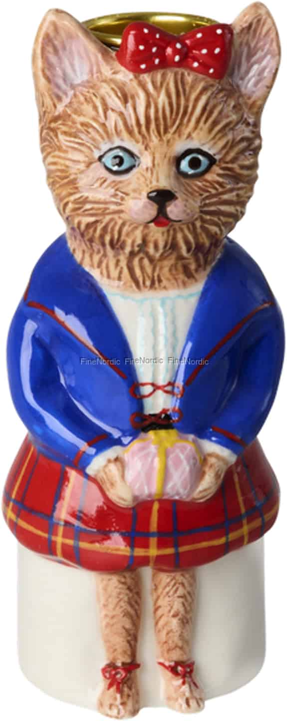Step into a world of pure imagination with this beautiful ceramic candleholder, born from a collaboration between Rice and the iconic French artist Nathalie Lété. This is more than just a home accessory; it's a character with a story to tell. With her bright blue eyes, smart tartan skirt, and a tiny gift held in her paws, she embodies a sense of joyful anticipation and heartfelt charm. Every detail, from the texture of her fur to the vibrant, glossy glaze, reflects the artist's signature folk-art style, turning a simple candleholder into a treasured keepsake.