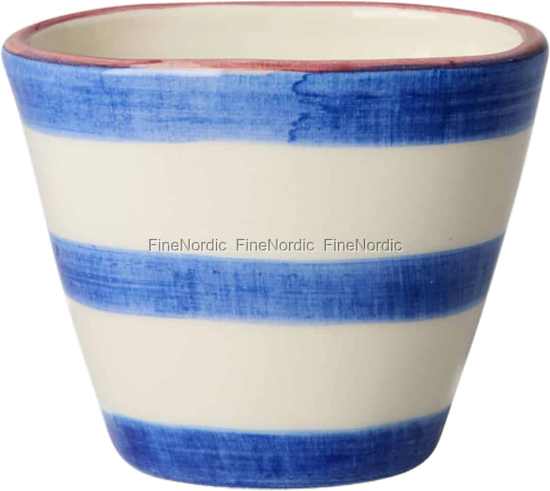 There's a special warmth in items made by human hands. This lovely espresso cup from Rice embodies that spirit, turning a coffee break into a moment of delight. Feel the smooth ceramic as you trace the bold blue stripes, each one carrying the unique touch of the artist's brush. The subtle reddish-pink rim adds a playful whisper of colour, a small detail that brings a smile. It’s a daily reminder to find joy in the little things.