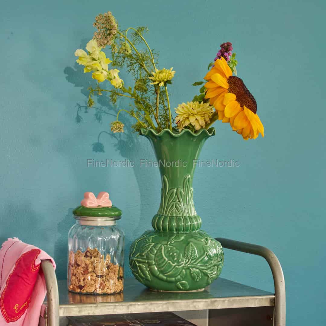 Imagine a piece that captures the lush beauty of a secret garden. This exquisite ceramic vase, with its rich green glaze and intricate floral details, is designed to be a joyful centrepiece in your home, waiting to hold your favourite blooms.