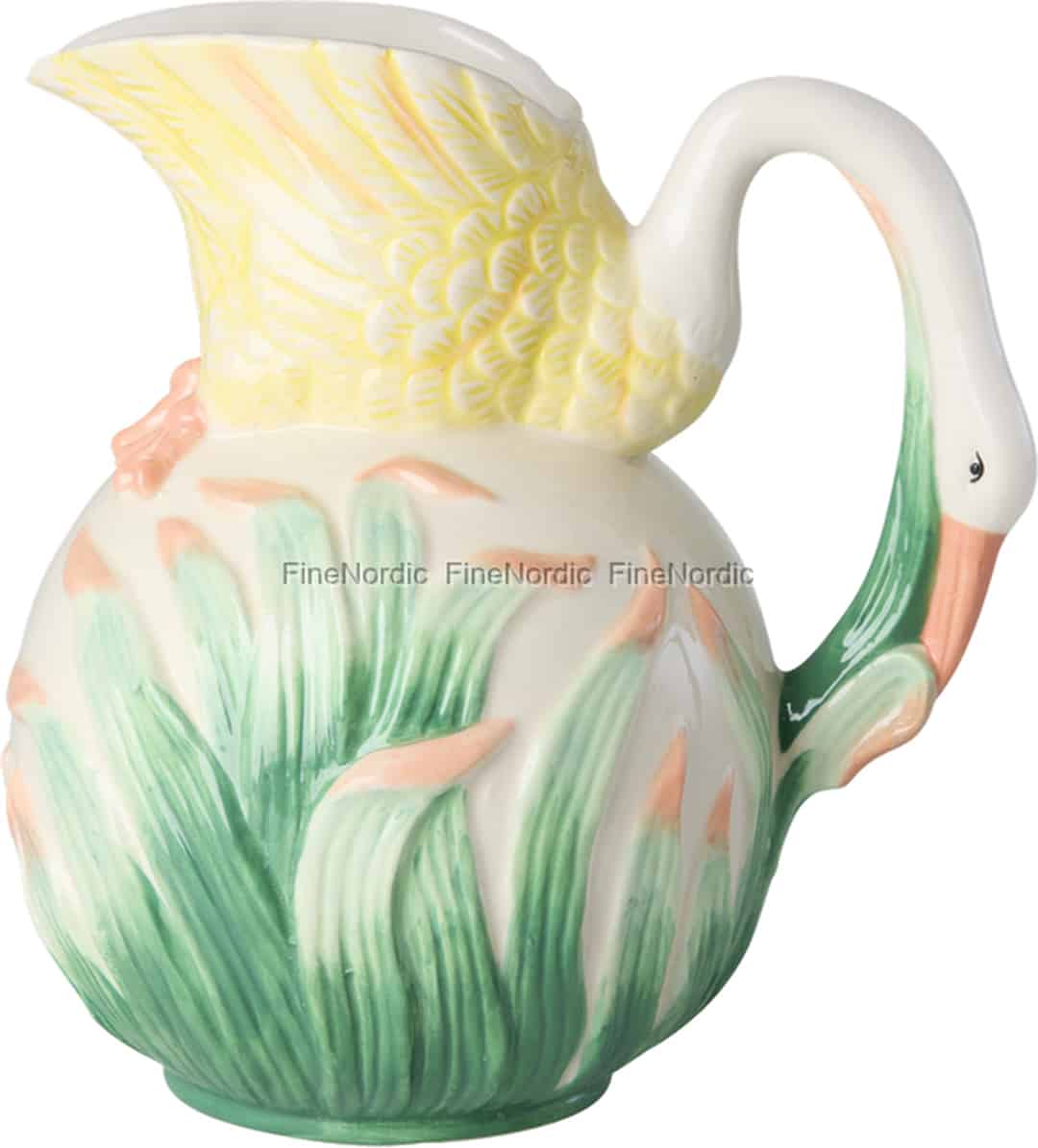 Let a little everyday enchantment pour into your home. This beautiful jug from Rice is more than just a vessel; it's a story captured in ceramic. The body, painted with delicate green reeds and soft pink buds, evokes a tranquil lakeside morning. From this scene, a graceful swan emerges, its neck curving into a comfortable handle and its pale yellow wings forming the spout. Every glance reveals a new detail, a testament to the playful and heartfelt design that makes this piece so special.