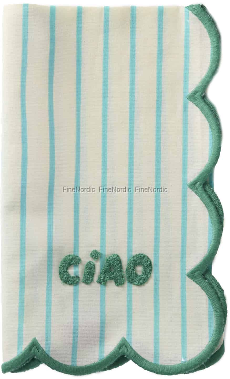 Bring a touch of playful Italian charm to your next gathering. This delightful cotton napkin, with its fresh mint stripes and cheerful 'ciao' greeting, is designed to make every meal feel like a special occasion.