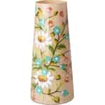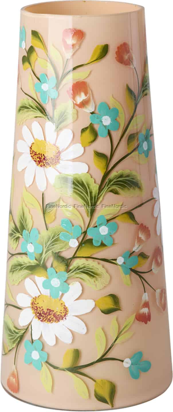 Let the joyful spirit of a summer meadow bloom in your home all year round. This exquisite glass vase by Rice is more than just a place for flowers; it's a celebration of colour and craftsmanship. The warm peach glass provides a perfect canvas for the vibrant, hand-painted florals that wrap around its surface. You can feel the delightful texture of the raised paint under your fingertips—the crisp white petals of the daisies and the charming clusters of small blue blossoms, all connected by winding green stems. It's a piece that tells a story of happy days and artistic passion.