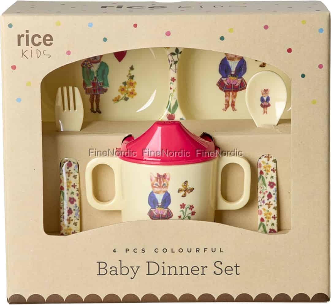 Step into the enchanting world of French artist Nathalie Lété, where charming characters and vibrant botanicals come to life. This delightful dinner set from Rice brings her unique, storybook aesthetic to your child's table. Dapper cats in waistcoats and rabbits in floral dresses invite your little one to dine in a magical forest, making every spoonful an adventure. The divided plate helps keep different tastes wonderfully separate, while the matching cutlery and sippy cup complete the enchanting scene.