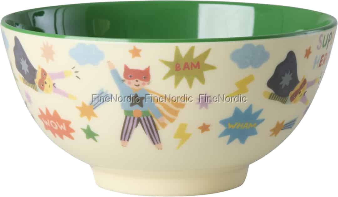 Every meal can be an extraordinary adventure with this wonderful 'Hero' bowl from Rice. The cream-coloured exterior provides the perfect canvas for a universe of caped crusaders, soaring through a sky of stars, clouds, and cheerful 'WHAM!' sound effects. It’s a design that tells a story, inviting your child to join in the fun and finish every last bite to help save the day. The bright, glossy green interior adds a surprising pop of colour that makes even simple snacks feel special.