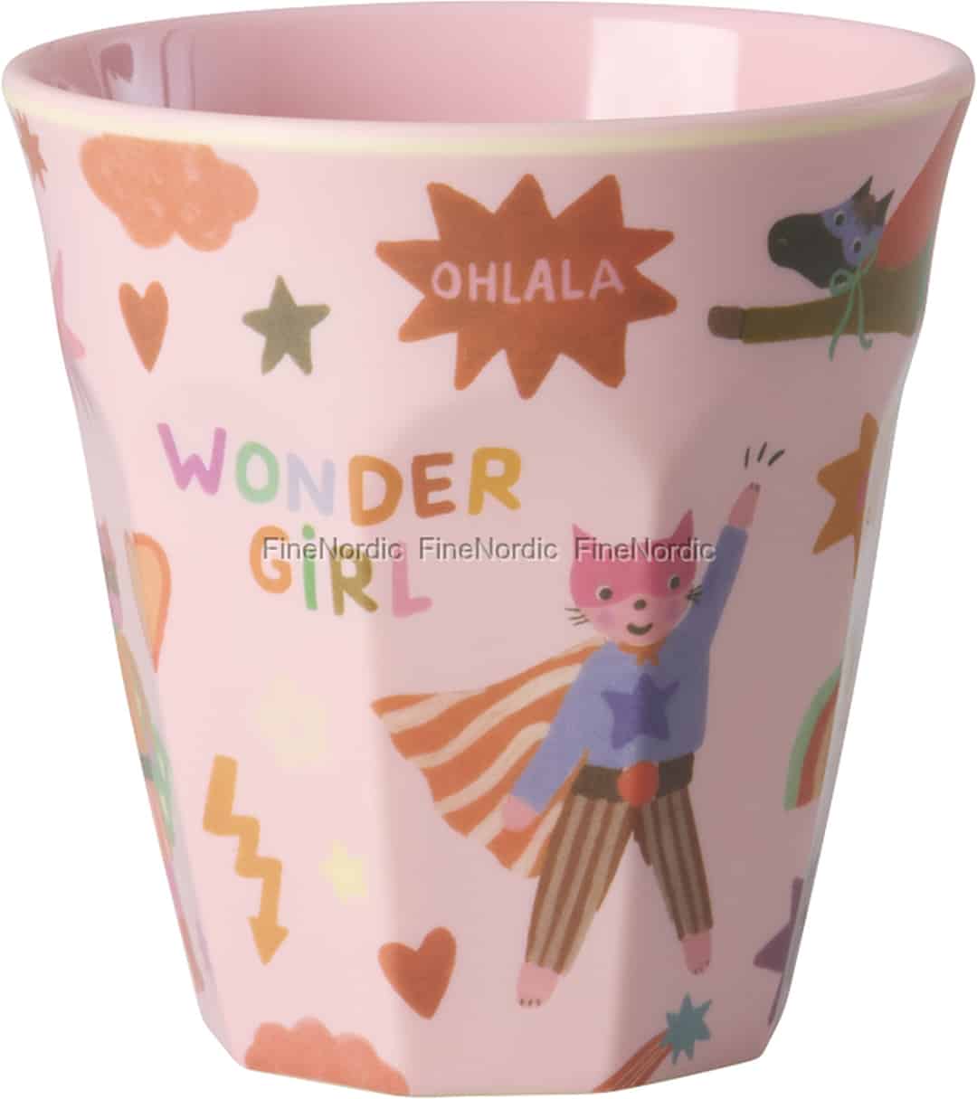 From the creative world of Rice comes a cup that's more than just for drinking—it's a little vessel of joy and encouragement. The soft pink hue provides a lovely backdrop for a world of adventure, where a superhero cat soars and 'Wonder Girl' saves the day. Each detail is designed to bring a smile, transforming a simple drink into a moment of playful inspiration. It’s a wonderful way to add a splash of colour and character to your child’s daily routine, reflecting the signature charm of Rice designs.