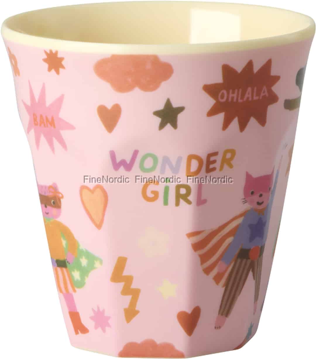 From the creative world of Rice comes a cup that’s more than tableware; it’s an invitation to play. This pink melamine cup celebrates the brave spirit in every child with its whimsical 'Hero' print. Featuring a friendly superhero girl and a caped cat, it reminds them that every day holds a new adventure. The soft cream interior provides a gentle contrast, making every drink look even more inviting as they fuel their grandest plans.