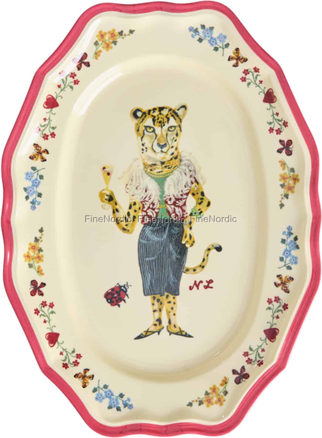 Discover the delightful world of Nathalie Lété, brought to life on this exquisite serving dish by Rice. At its heart is a wonderfully eccentric leopard, dressed for a soirée and ready to toast the occasion. Her charming character is framed by a delicate garland of wildflowers and butterflies, set against a creamy backdrop with a cheerful reddish-pink scalloped rim. This isn't just a piece of tableware; it's a story waiting to be told, a spark of imagination for your home.