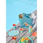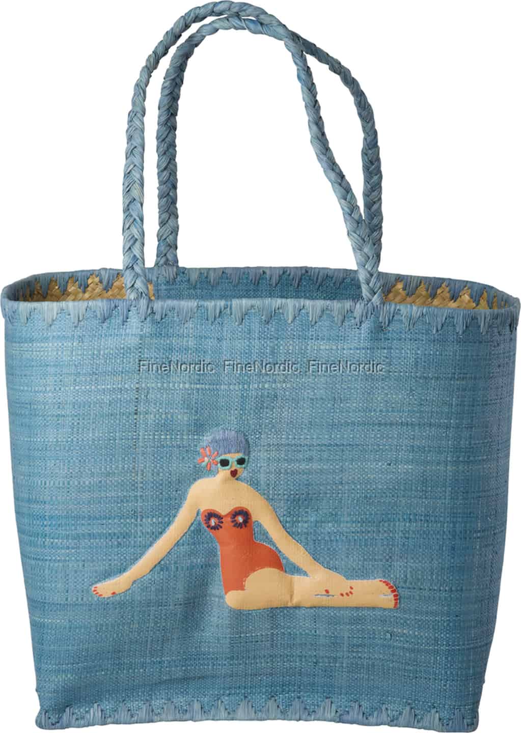 Picture a perfect summer's day: the sun is warm on your skin, and a gentle breeze is in the air. This beautiful raffia bag from Rice is designed to be right there with you, capturing the carefree essence of those cherished moments. The delightful sky-blue weave is the perfect backdrop for its star: the charming 'Lady Swimster', an appliqué full of retro character who seems to be enjoying her own blissful day of leisure. Her presence turns a simple tote into a conversation piece, a nod to glamorous seaside holidays of the past.