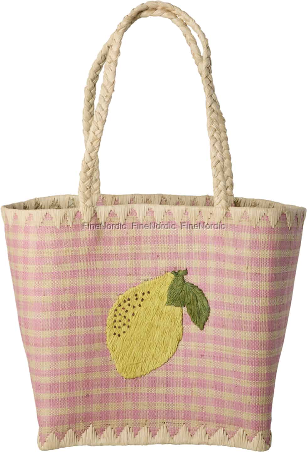 Imagine packing your essentials for a spontaneous picnic or a leisurely stroll through the farmer's market. This delightful raffia bag from Rice, with its cheerful pink check and zesty lemon embroidery, is ready for any sunny day's adventure.