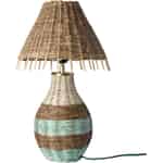 Embodying the playful spirit of Danish design, this tall table lamp from Rice is a celebration of colour, texture, and craftsmanship. Each lamp is skilfully woven from natural raffia, giving it a unique, handmade character that feels both authentic and charming. The vase-shaped base is a canvas for cheerful stripes in earthy brown, soft cream, and a refreshing splash of turquoise, bringing a sense of warmth and personality to your interior. It's a piece that tells a story of artistry and happy moments.